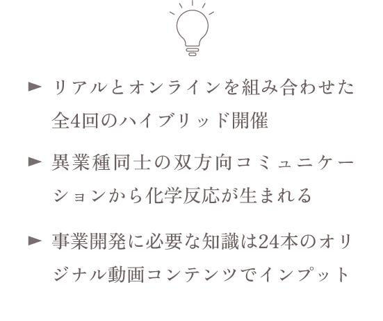 単なる研修にとどまらず、ネットワーク内での対話や交流を通じて事業構想を磨き、