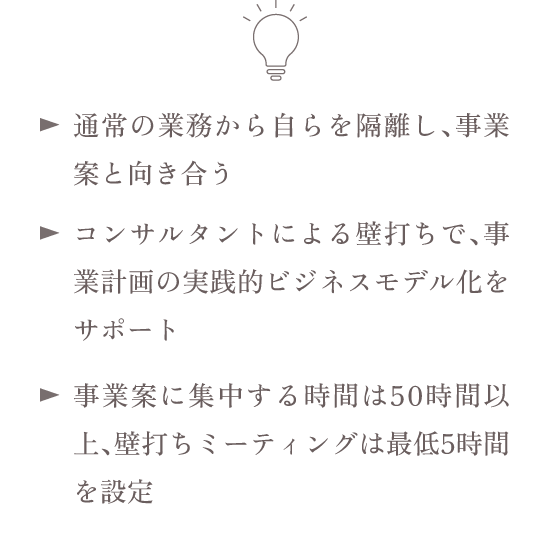 - 通常の業務から自らを隔離し、事業案と向き合う(50時間以上)